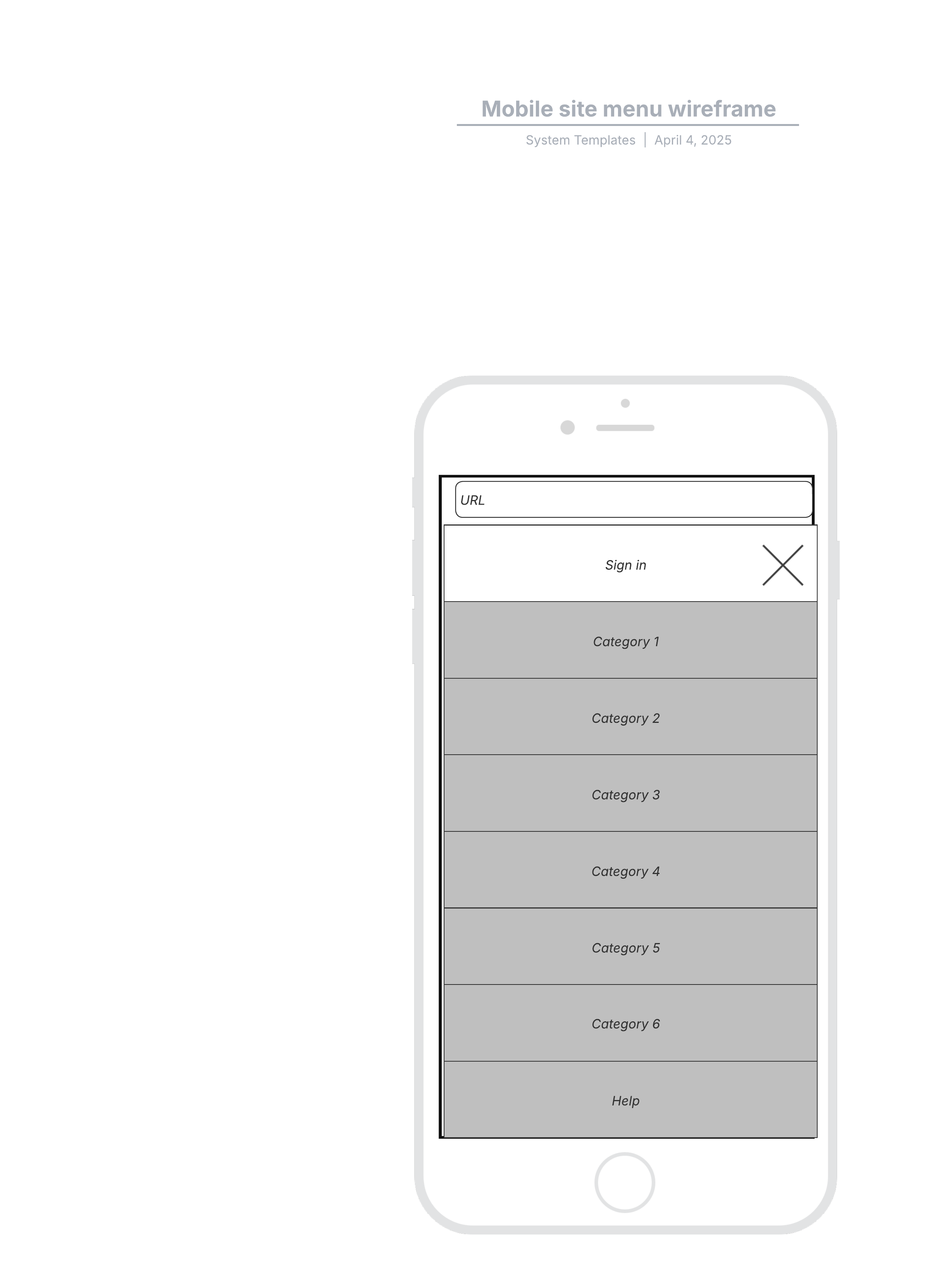 Open this template to view a detailed example of a mobile site menu wireframe that you can customize to your use case.