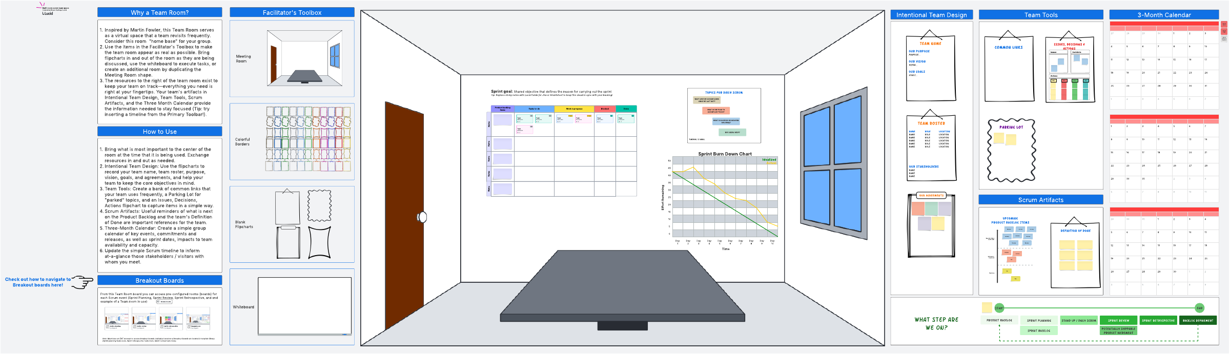 This Multi-room scrum team template is your team's home base with all the scrum resources and corresponding breakout boards.