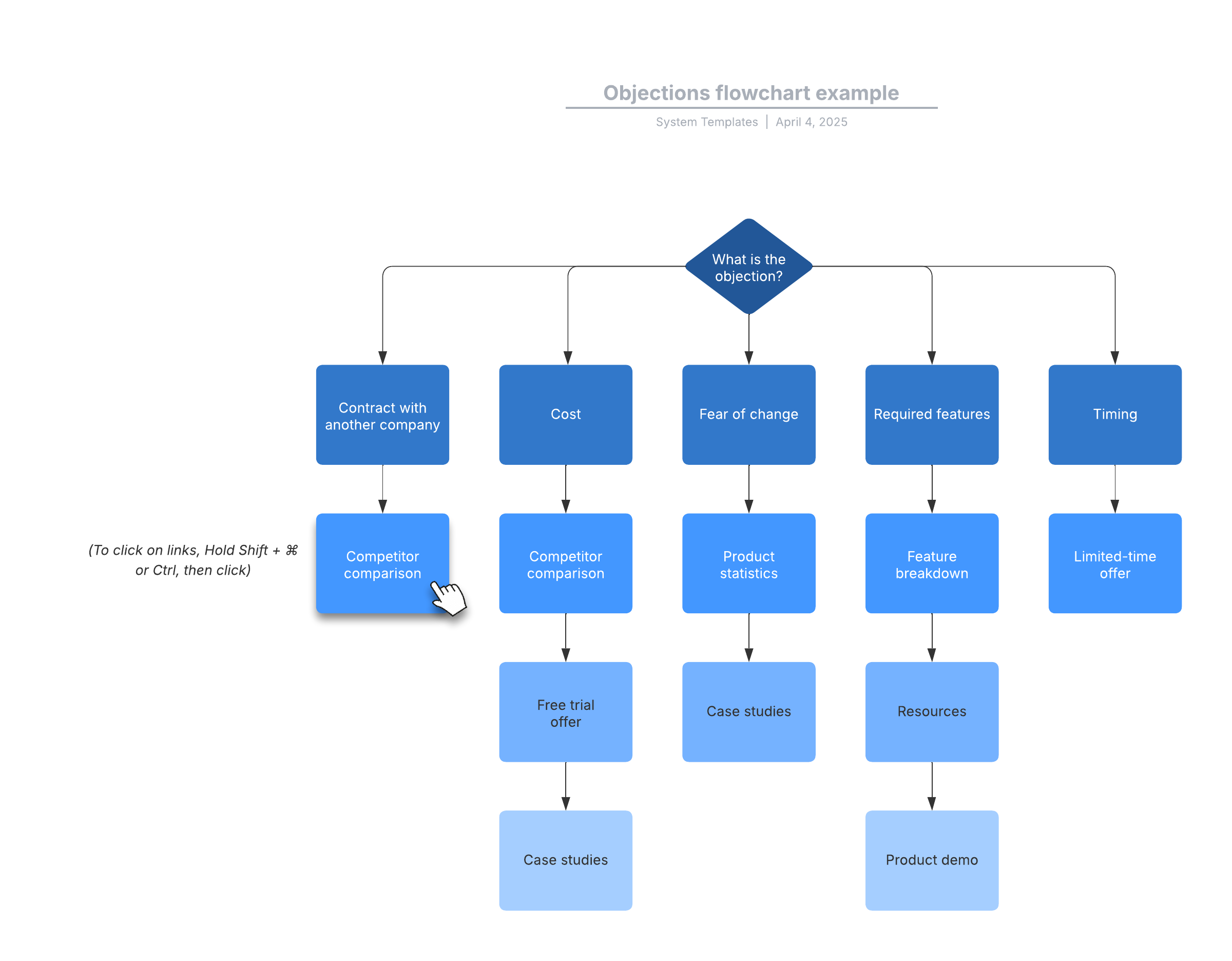Open this template to view a detailed example of an objections flowchart that you can customize to your use case.
