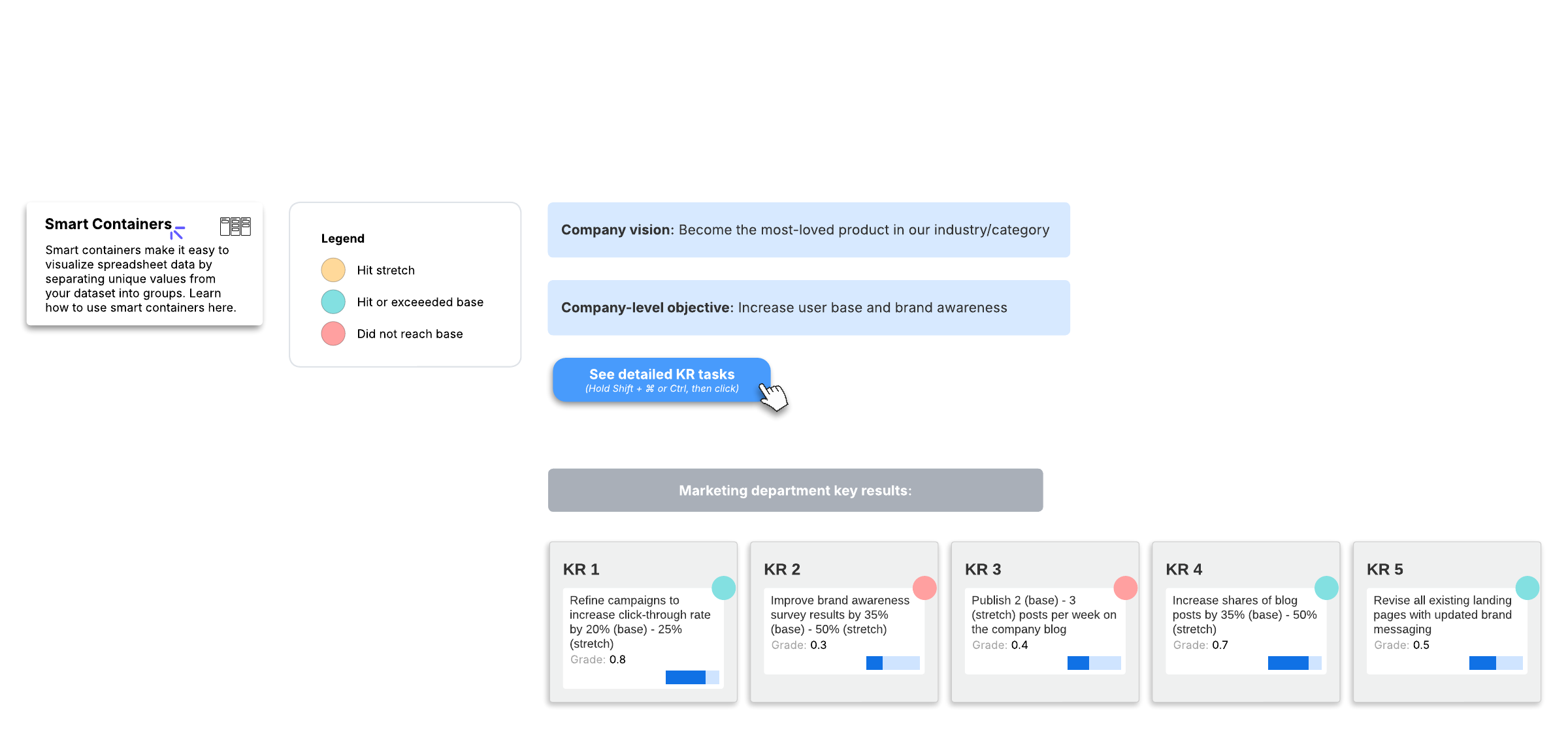 Open this template to view a detailed example of a OKR dashboard for marketing that you can customize to your use case.