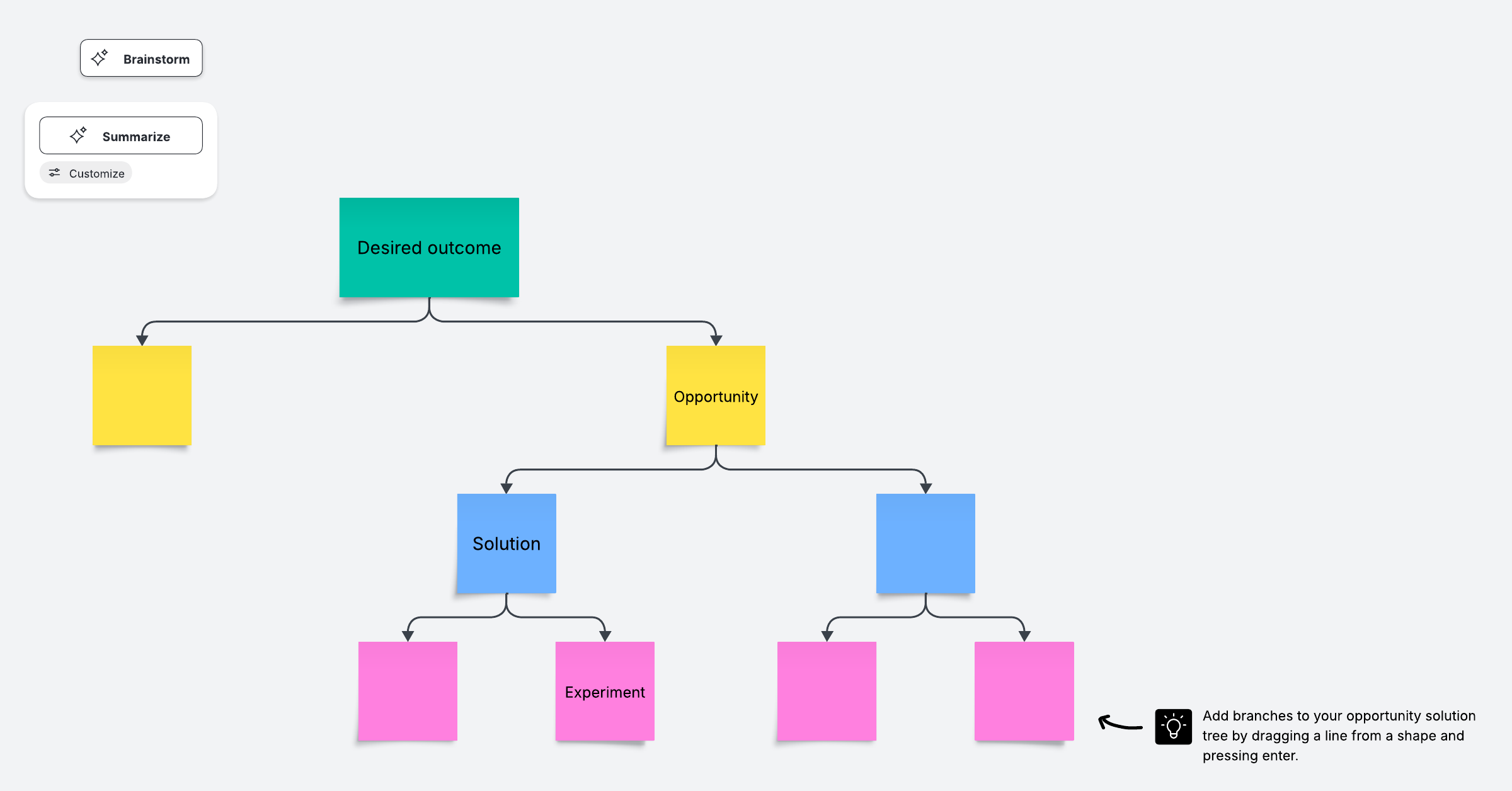 Solve your problems with this opportunity solution tree. Start at the top with a desired outcome, then flow down to opportunities to meet user needs. From each opportunity, generate solutions and define team action items to make them a reality.