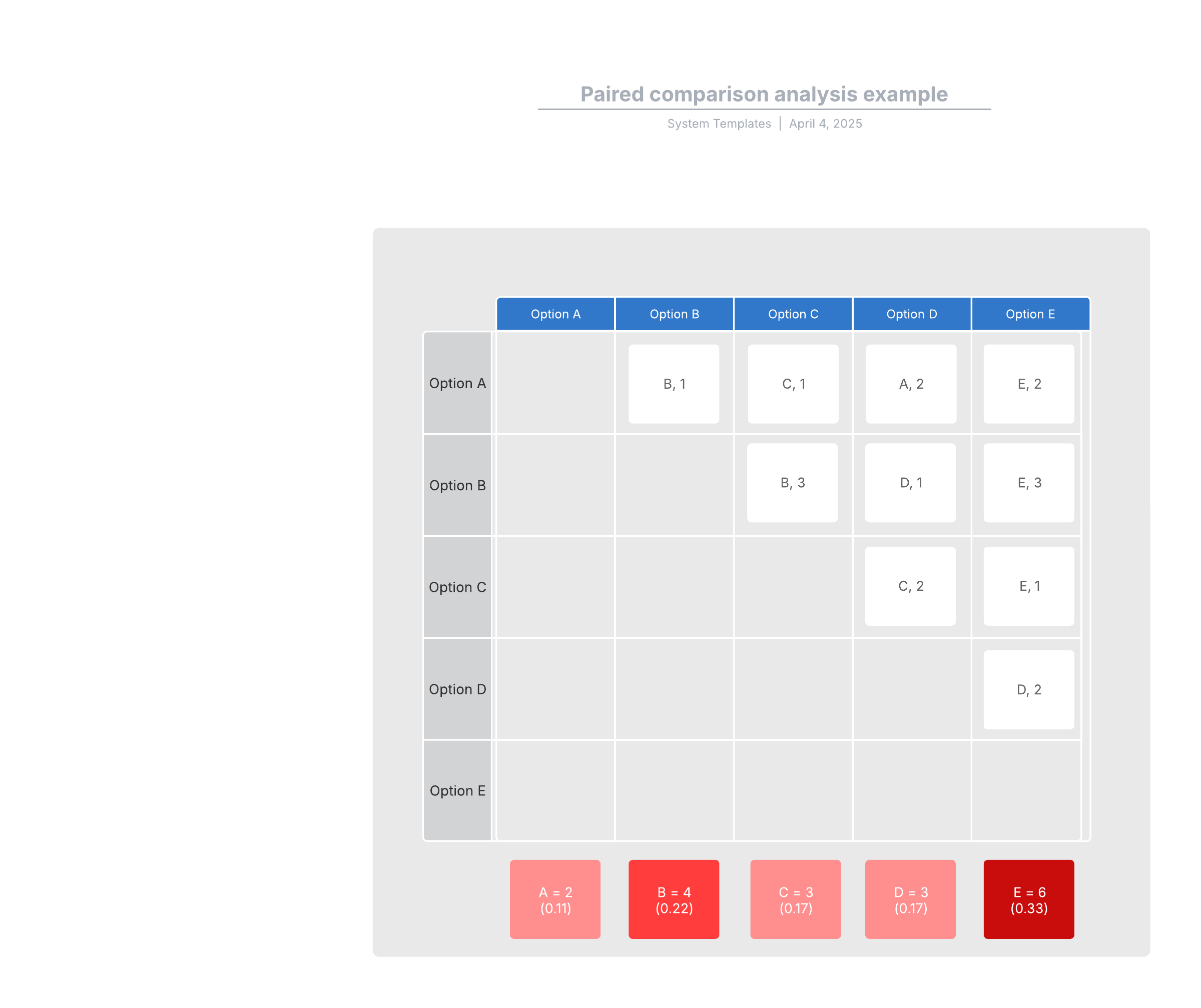 Open this template to view a detailed example of a paired comparison analysis diagram that you can customize to your use case.