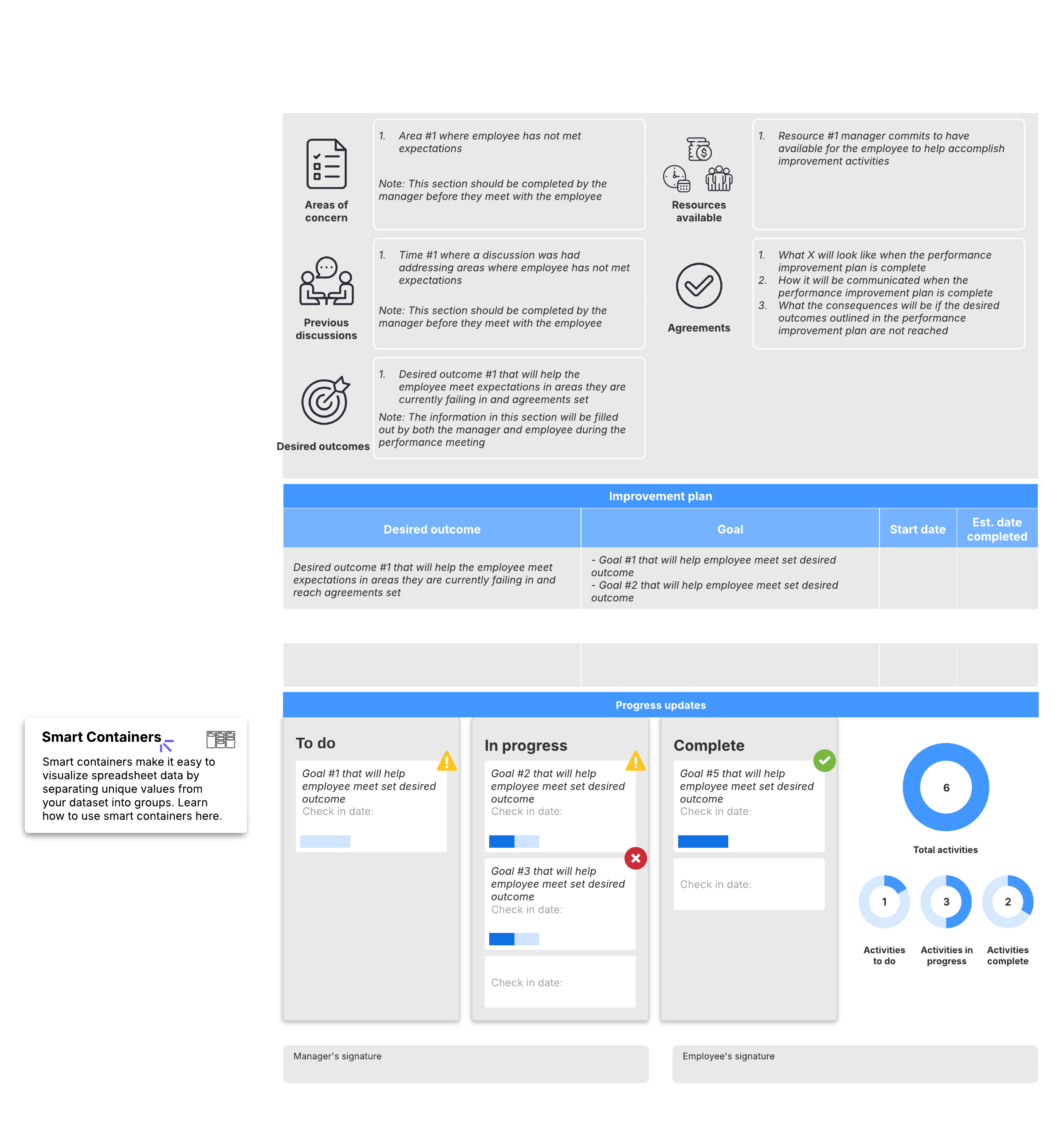 Open this template and add content to customize this performance improvement plan (PIP) dashboard to your use case.
