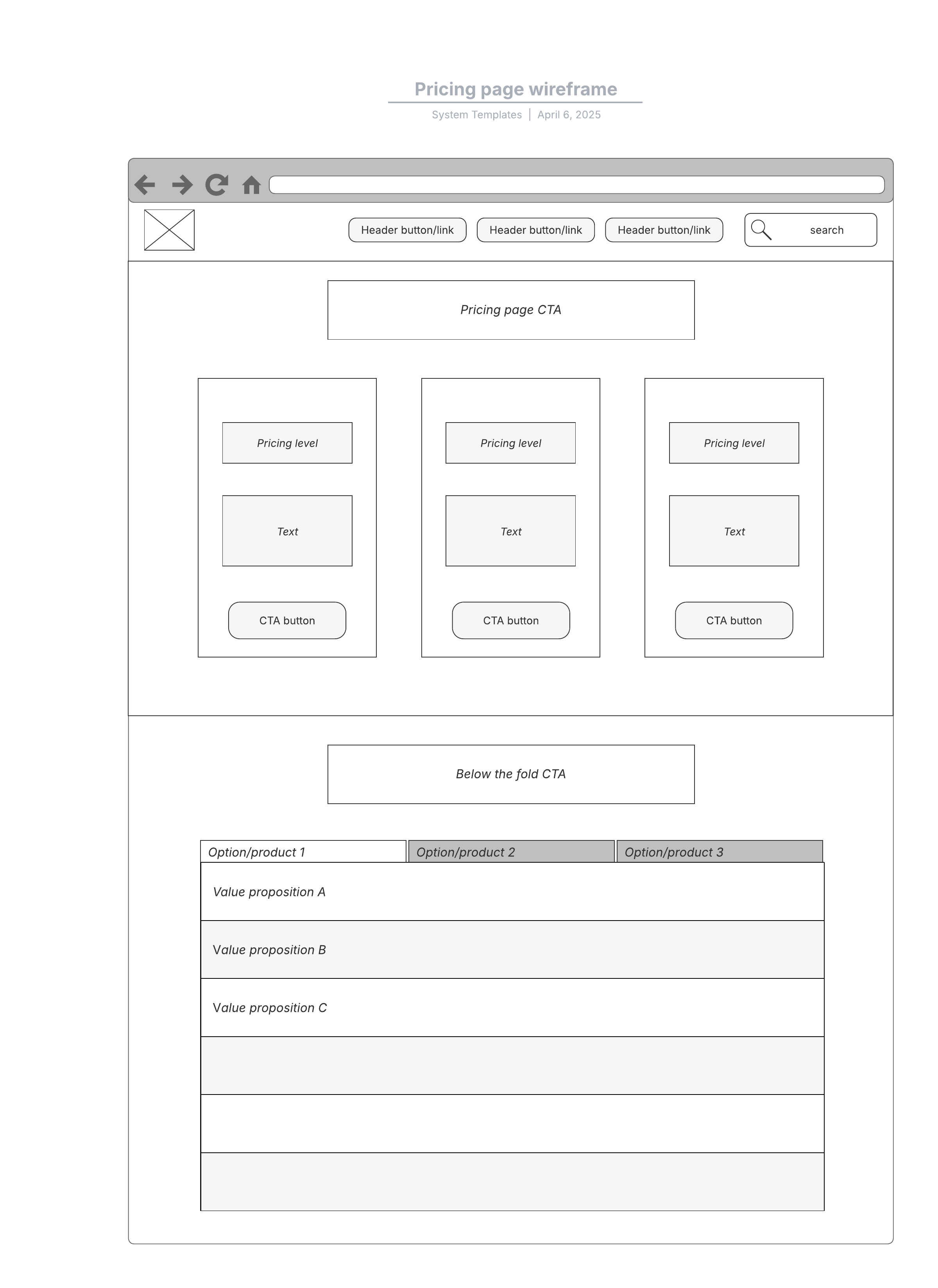 Open this template to view a detailed example of a pricing page basic wireframe that you can customize to your use case.