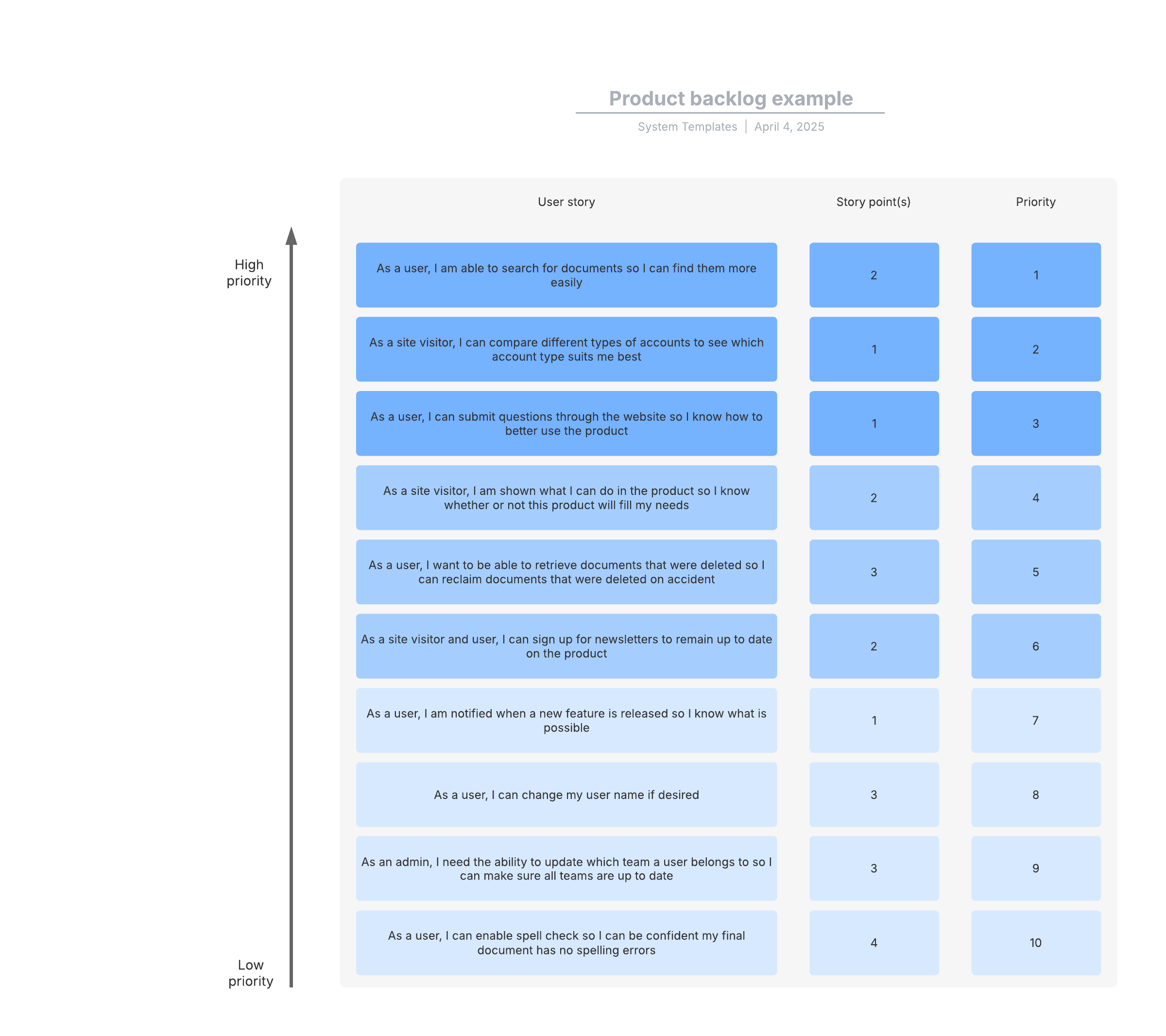 Open this template to view a detailed example of a product backlog diagram that you can customize to your use case.