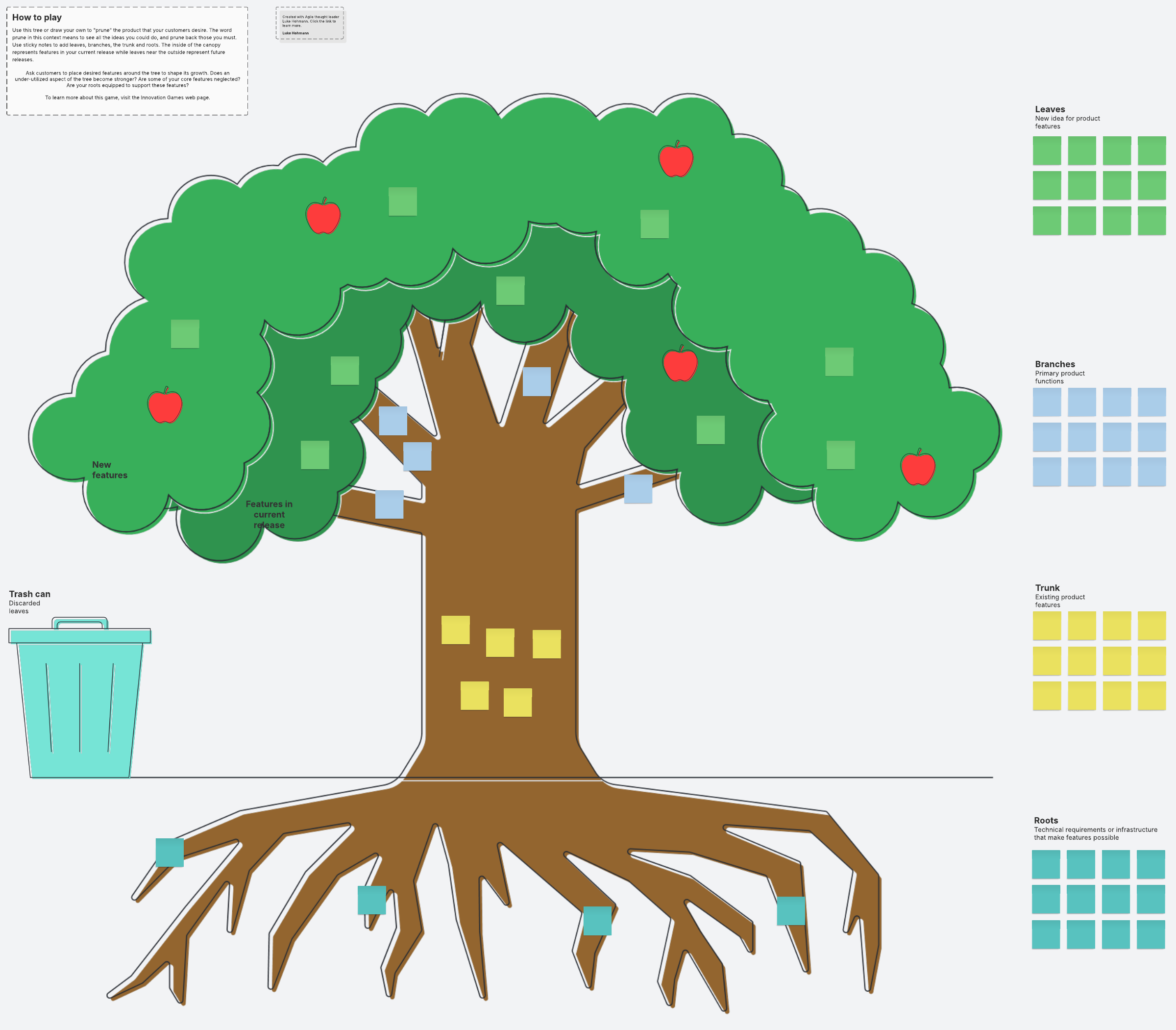 Feel free to share and discuss some initial examples of the roots, trunk, and branches of your product so people know what to add to these sections, or opt to fill them out yourself and invite additions as the game begins.