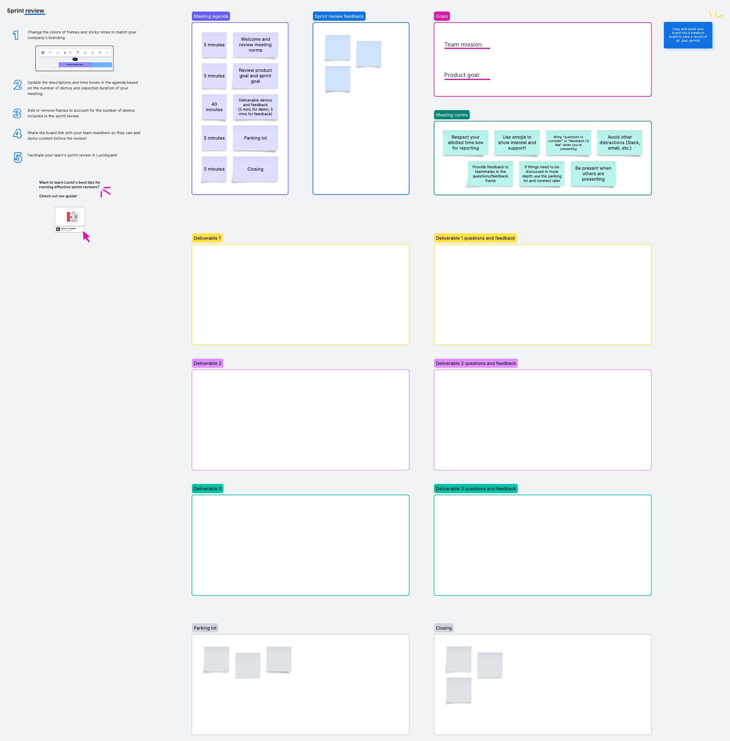 When you use this template for each sprint review, you’ll have everything you need in one place. The template will help keep the meeting on track as everyone follows along with the agenda to discuss goals, decide on meeting norms, and provide feedback.