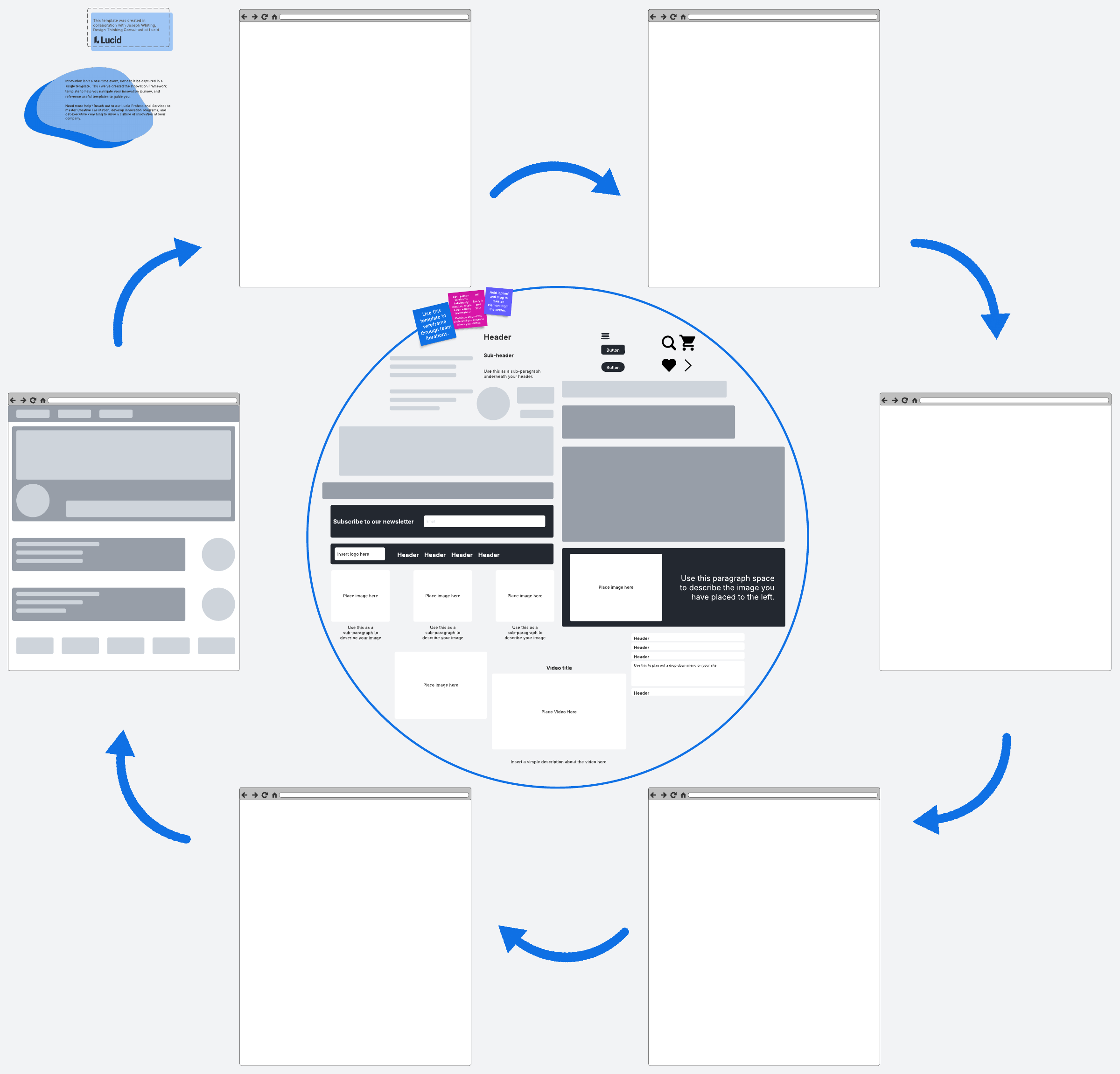 The rotational desktop wireframing template is a fun, collaborative way to come up with entire webpage wireframes in a set amount of time. You can use it throughout an entire meeting to develop a real webpage or use it as a fun activity to build teamwork and encourage creativity.