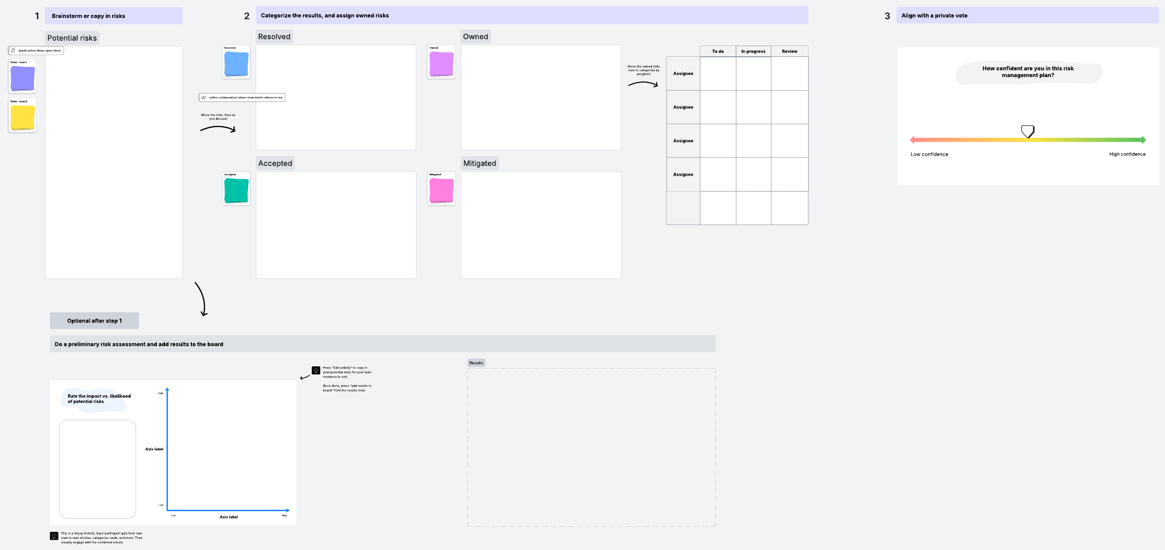 Identify and address potential risks in a collaborative space with the SAFe ROAM template. Categorize risks and align with your team to create a flexible, effective risk management plan.