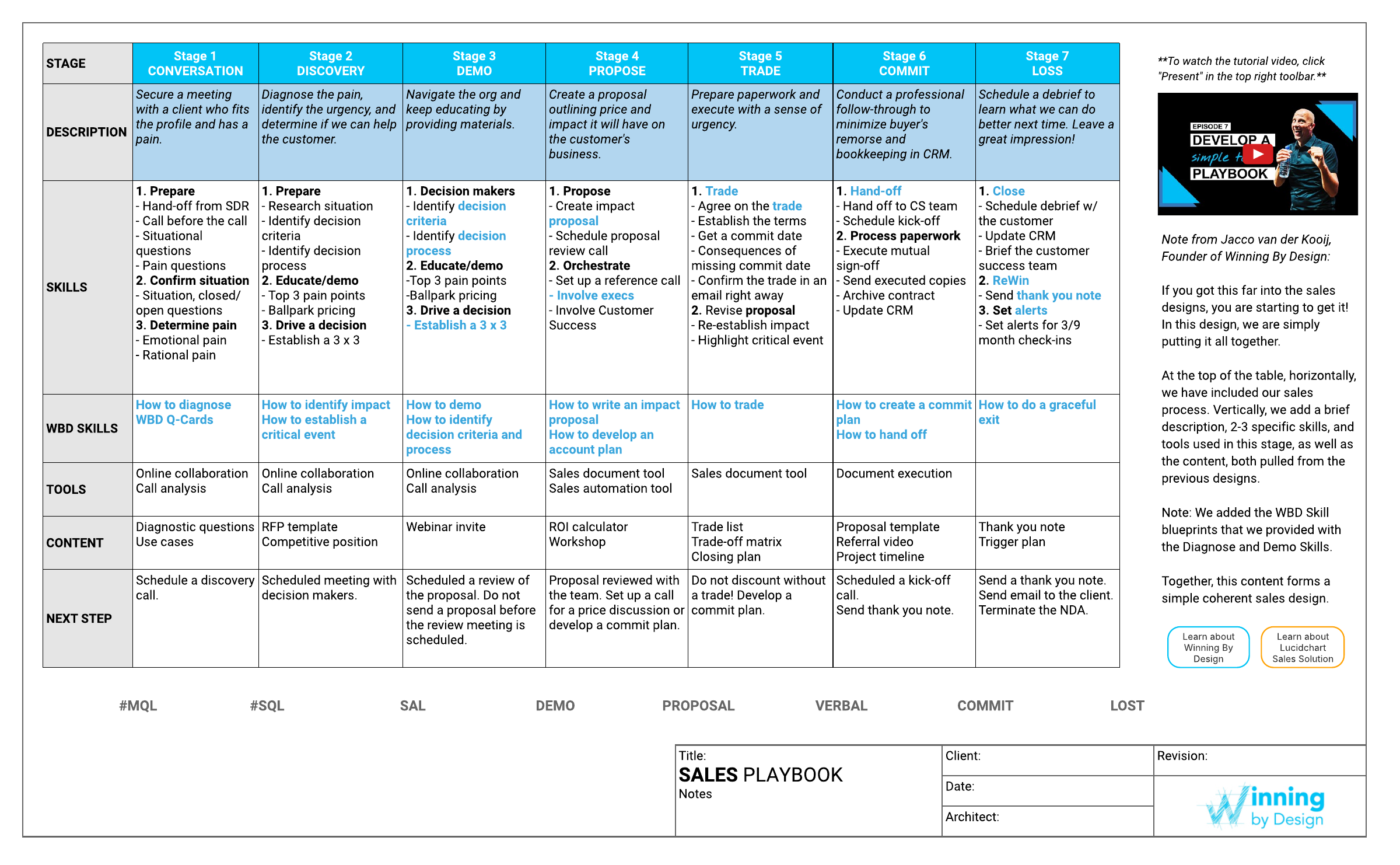 To learn more about optimizing the Sales playbook template, see the tutorial video to the right of the template from the founder of Winning By Design, Jacco van der Kooij. The video provides more context and instruction about the template and how it can assist you in perfecting your sales process.