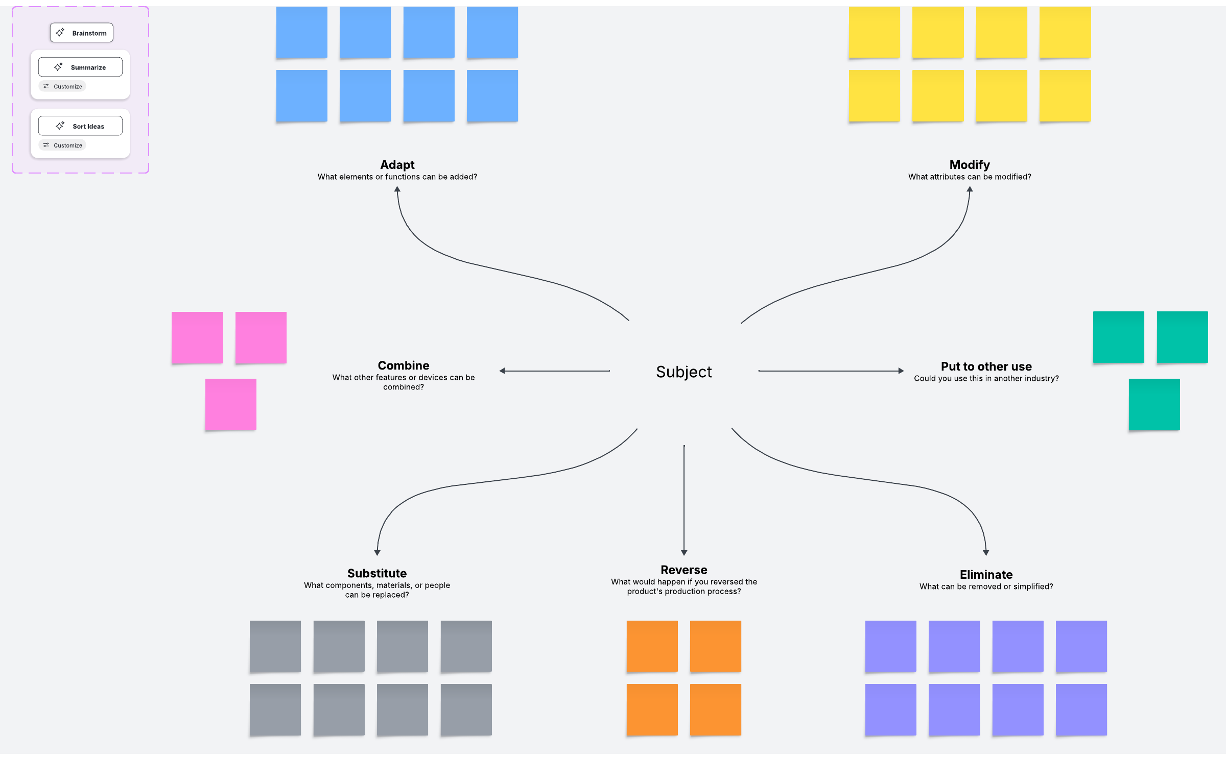 As your team uses each lens to come up with problem-solving strategies, you’ll be able to unlock a variety of fresh ideas. Lucidspark’s SCAMPER framework makes it easy to keep all those ideas in the same place.