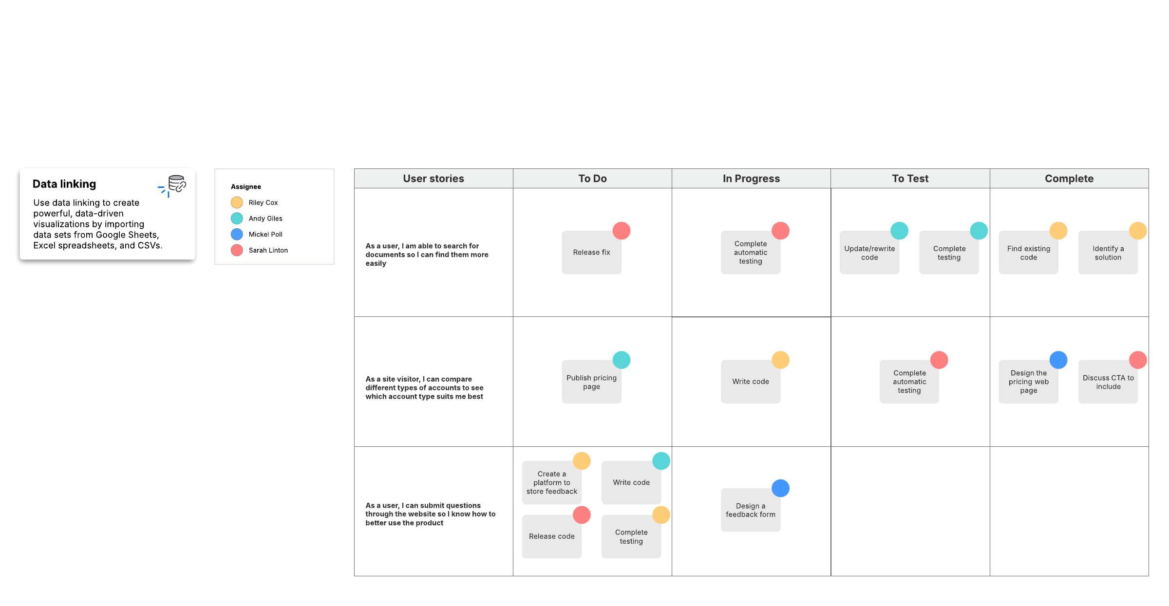 Open this template to view a detailed example of a scrum task board that you can customize to your use case.