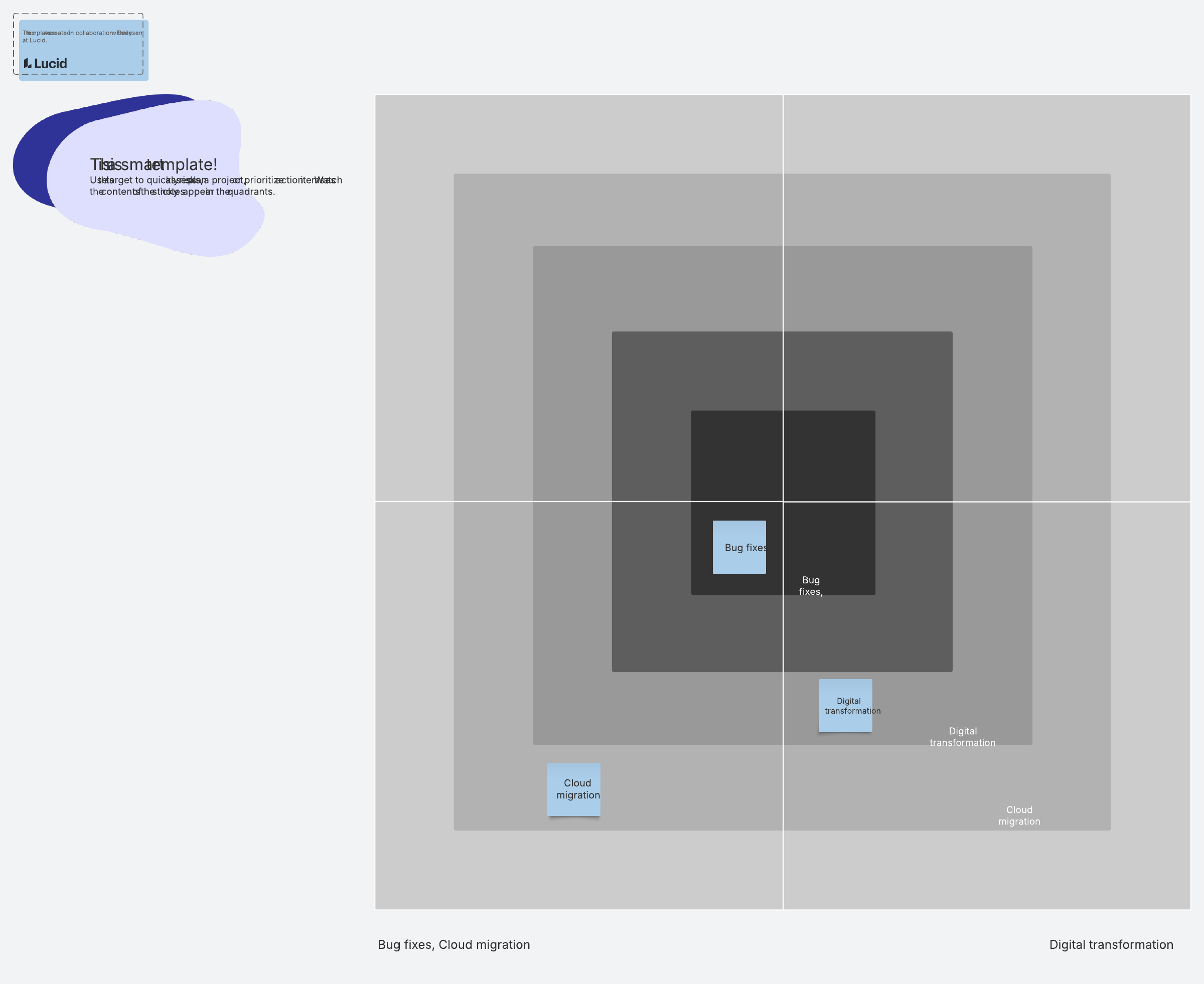 Even better, this template is a smart template! As you add sticky notes to the target, the content of the sticky notes will appear throughout the quadrants. That means you can easily prioritize action items after you’ve finished adding sticky notes. To familiarize yourself with the smart target template, drag around sticky notes to see how the content populates outside the target area.