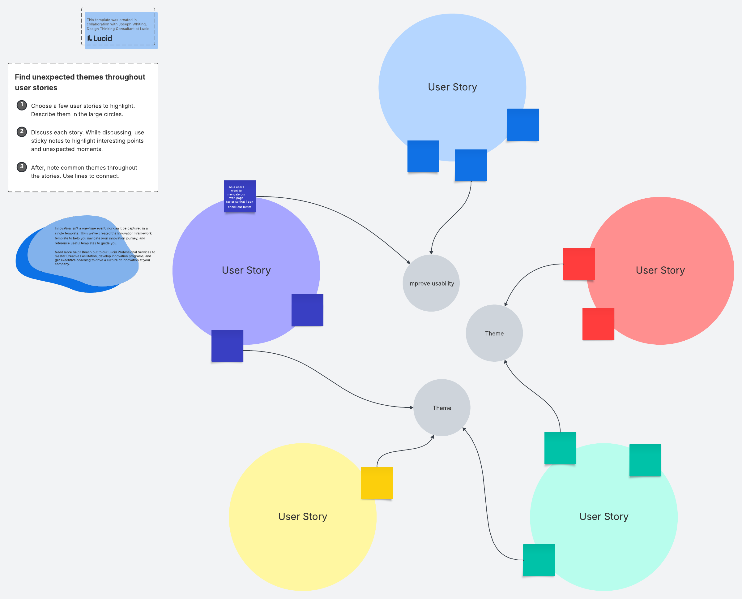 - Choose a few user stories to highlight. Describe them in each of the large circles.