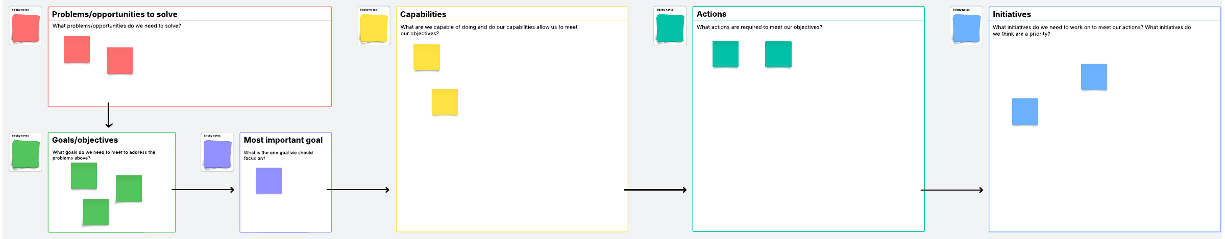 During the strategic planning session, take your group through each section of the template. You’ll start by identifying what problems you need to solve and what goals will address those problems. Next, you’ll consider your team’s capabilities, what actions you’ll need to take to meet your goals, and what initiatives will help you get there. Fill in each section with your group’s thoughts on sticky notes.
