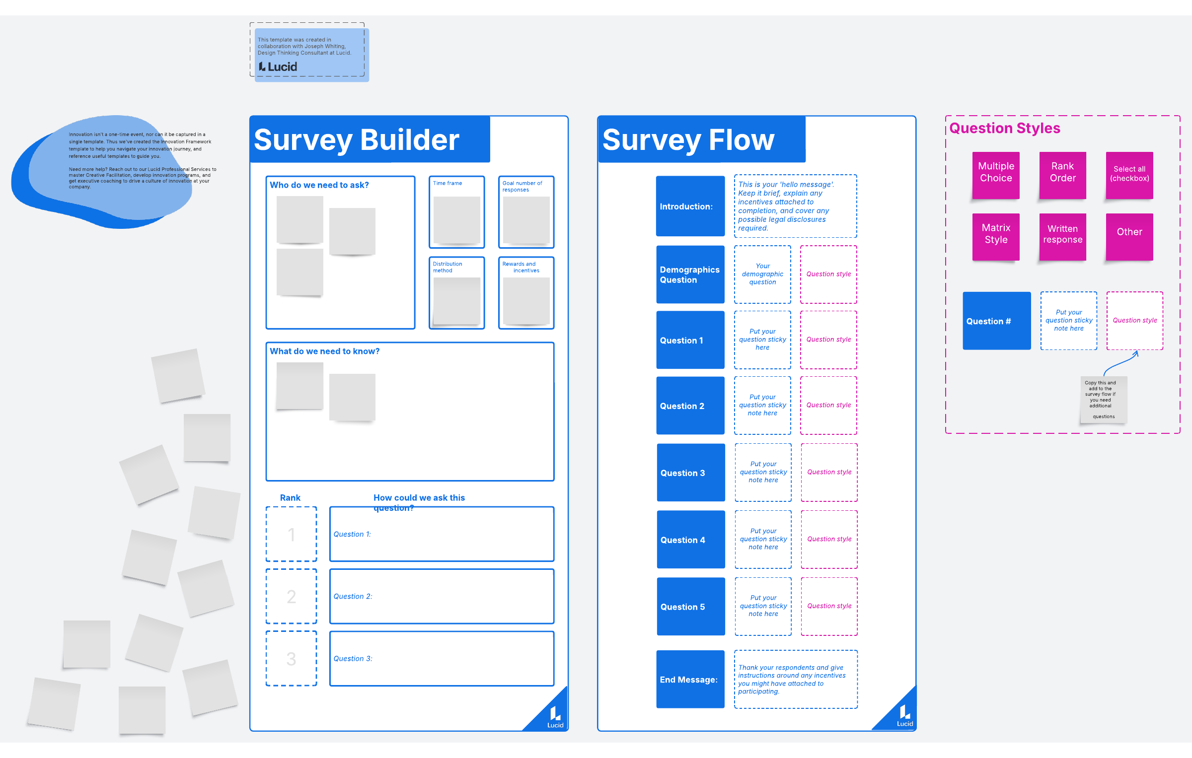 Created as one 80 Design Thinking templates by Joseph Whiting, Lucidspark’s survey builder can help you and your team collaborate on, design, and build a successful survey. The survey builder provides a blueprint to help you determine the parameters of your survey so you can proactively create a good survey flow.