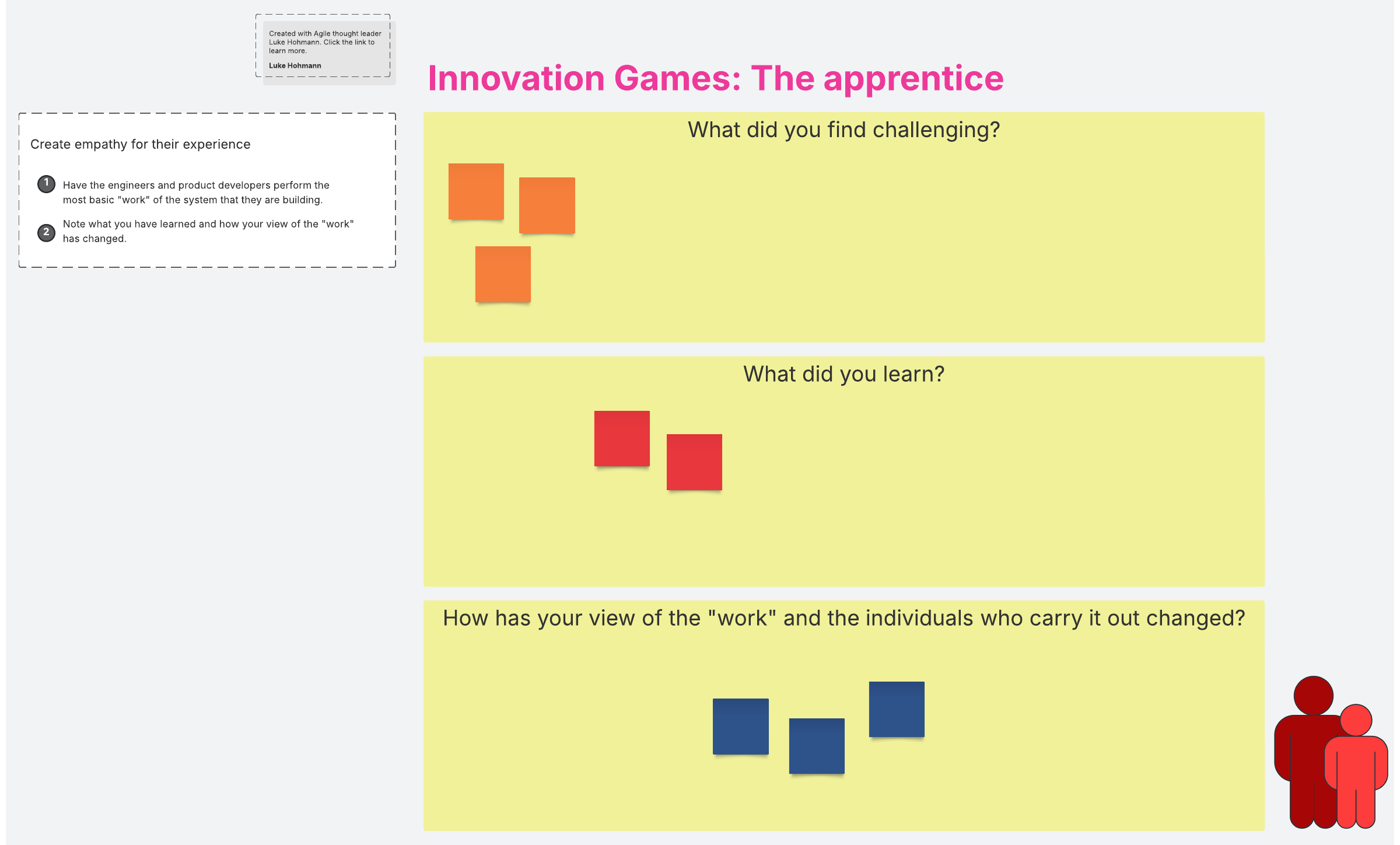 The point of The Apprentice game is to help product developers or software engineers experience the product they are building the way their customers do. The game itself is simple: have your team use the product to perform the most basic “work” the product will be used for, and then have them analyze their experience using Lucidspark’s apprentice game template.
