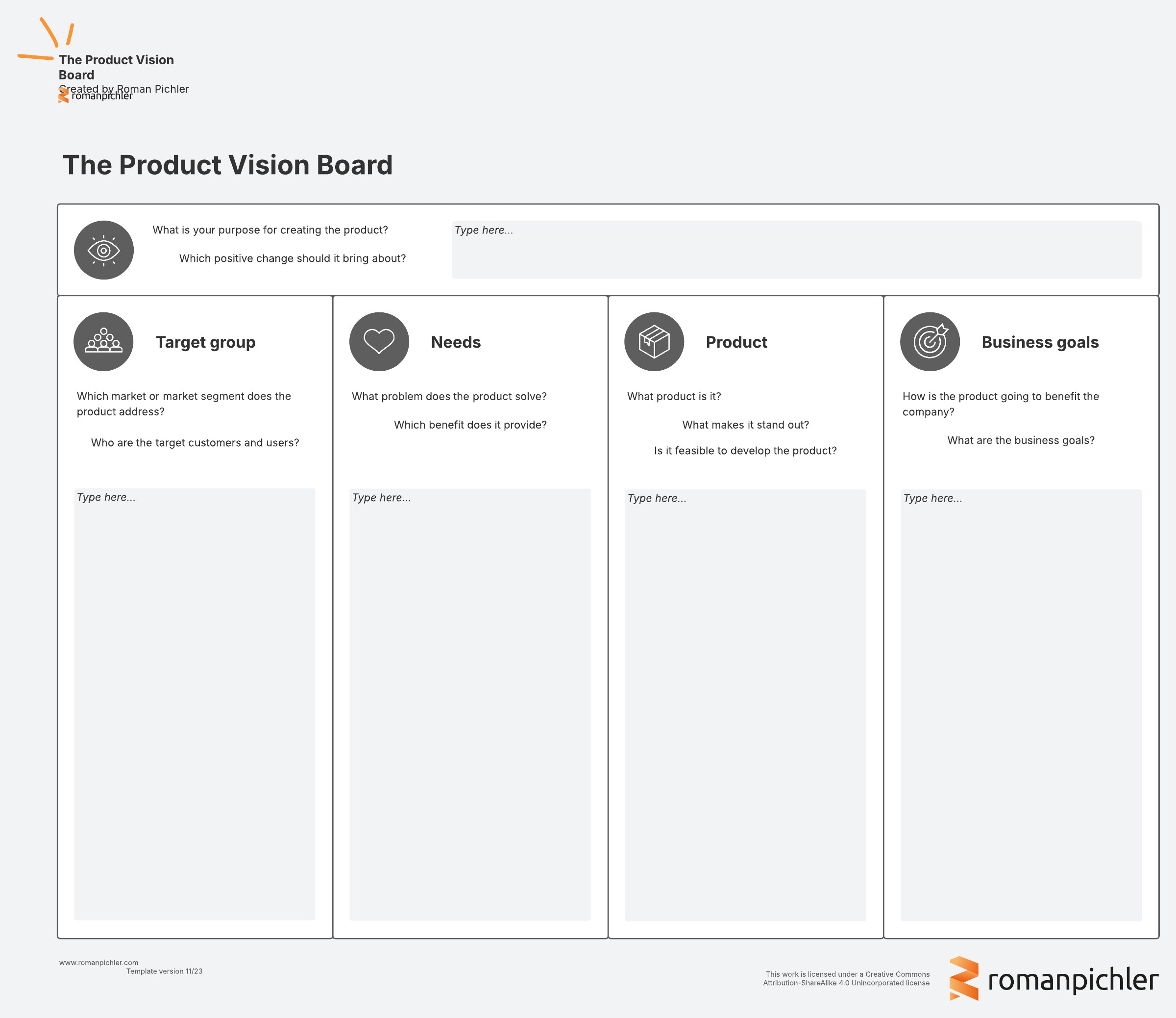 Use this Product Vision Board, originally created by product management expert Roman Pichler, to help you describe your product vision and strategy. Capture key details about your target group, user needs, product features, and business goals all in one place.