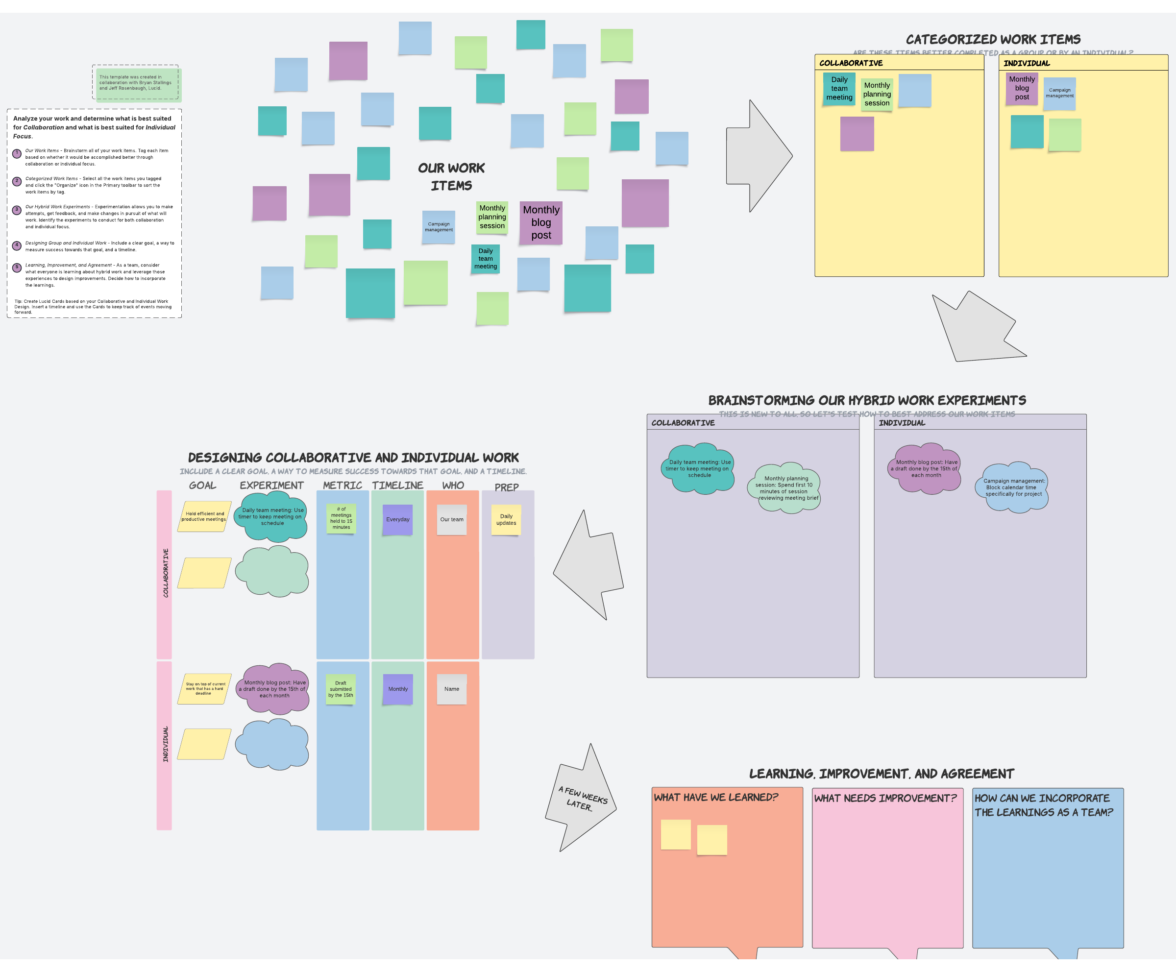 Our Lucidspark collaborative template will allow you to gather feedback from employees and efficiently test new ways to accomplish your work. Rather than simply going back to the way things were done before, you’ll be able to use the best of both remote and in-office work practices with a learning, testing approach.