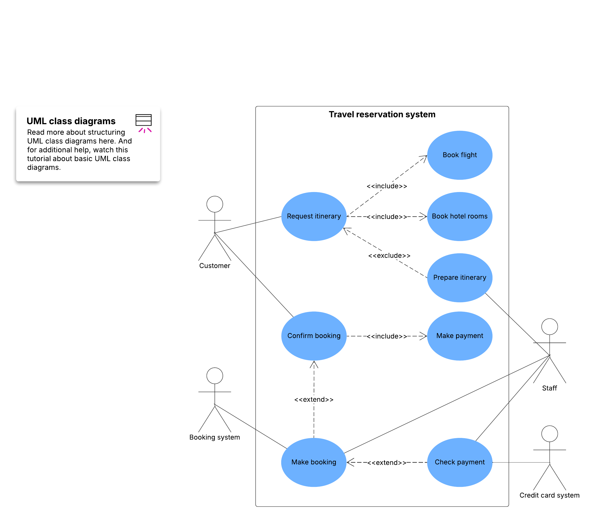 Open this template to view a detailed example of a travel reservation use case diagram that you can customize to your use case.