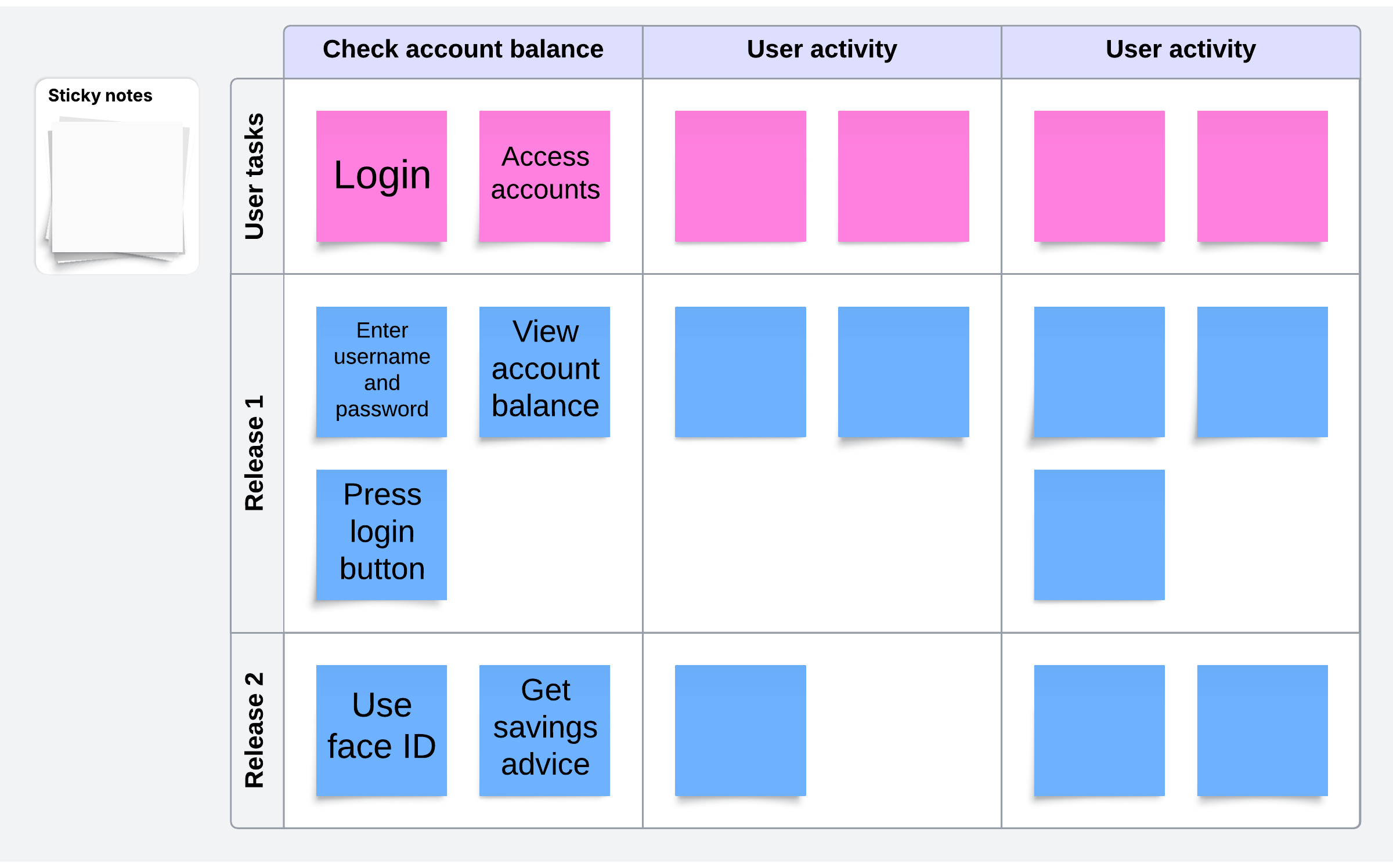 You can use sticky notes to easily expand the template and include more information and user stories. Once you’ve grouped user stories by tasks and activity, you can also easily divide them up by product iteration to see any differences in the user experience.