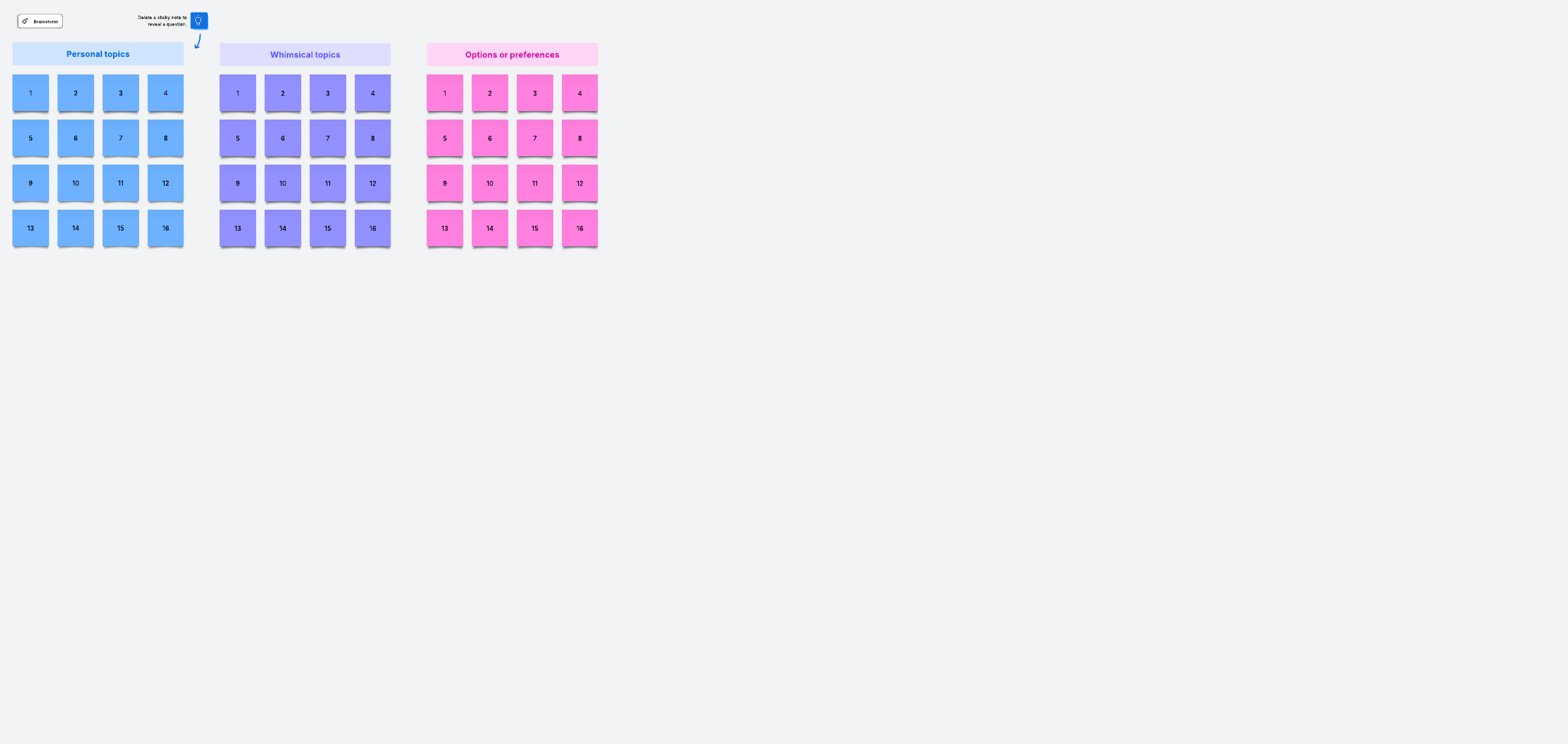 Once people are meeting in their groups, take turns answering the water cooler questions. When it’s your turn, start by stating your name, amount of time at the company, and role. Then choose a sticky note from anywhere in your group’s container and delete it—there’s a question about a water cooler topic underneath each one . Answer the question and answer any follow-up questions from the group, and let someone else take a turn.