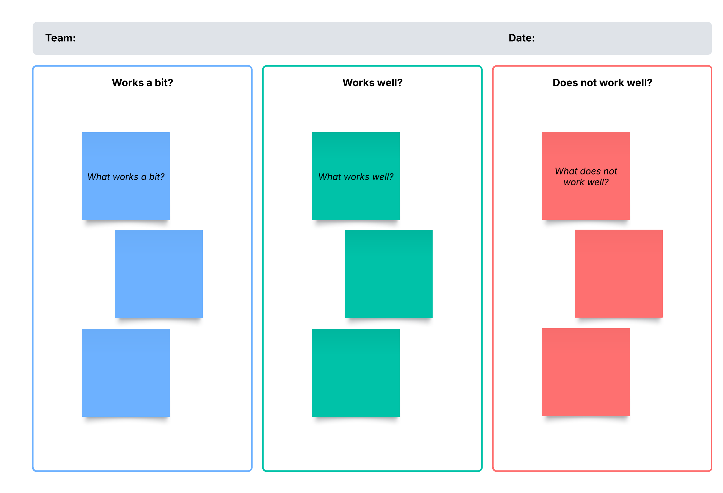 - Identify what works a bit, what works well, and what does not work well during your team's last sprint.